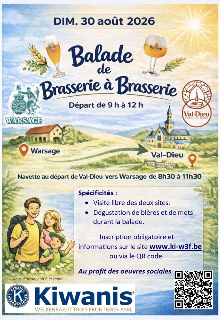 le Kiwanis Welkenraedt 3 Frontières ASBL vous propose une balade de brasserie à brasserie au profit de ses œuvres sociales. Cette année, nous comptons financer un triporteur électrique pour transporter une personne en fauteuil roulant. Le triporteur sera mis à disposition dans la région.